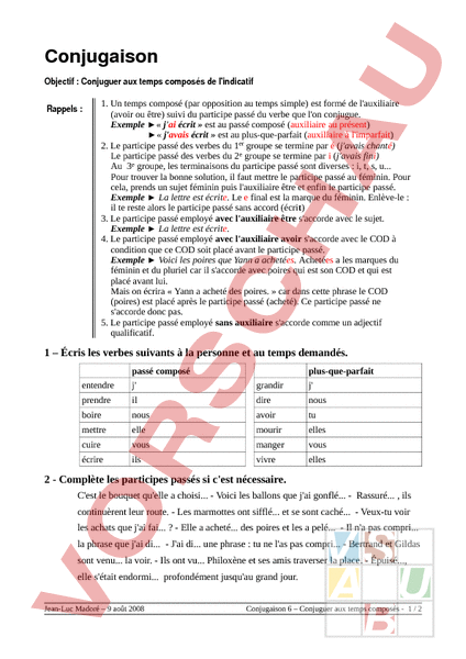 Conjugaison Objectif Conjuguer aux temps composés de lindicatif Rappels 1. Un temps composé (par opposition au temps simple) est formé de lauxiliaire (avoir ou être) suivi du participe passé du verbe que lon conjugue. Exemple « jai écrit » est au passé composé (auxiliaire au présent) « javais écrit » est au plus-que-parfait (auxiliaire à limparfait) 2. Le participe passé des verbes du 1er groupe se termine par é (javais chanté) Le participe passé des verbes du 2e groupe se termine par (javais fini) Au 3e groupe, les terminaisons du participe passé sont diverses i, t, s, u. Pour trouver la bonne solution, il faut mettre le participe passé au féminin. Pour cela, prends un sujet féminin puis lauxiliaire être et enfin le participe passé. Exemple La lettre est écrite. Le final est la marque du féminin. Enlève-le il te reste alors le participe passé sans accord (écrit) 3. Le participe passé employé avec lauxiliaire être saccorde avec le sujet. Exemple La lettre est écrite. 4. Le participe passé employé avec lauxiliaire avoir saccorde avec le COD à condition que ce COD soit placé avant le participe passé. Exemple Voici les poires que Yann achetées. Achetées les marques du féminin et du pluriel car il saccorde avec poires qui est son COD et qui est placé avant lui. Mais on écrira « Yann acheté des poires. » car dans cette phrase le COD (poires) est placé après le participe passé (acheté). Ce participe passé ne saccorde donc pas. 5. Le participe passé employé sans auxiliaire saccorde comme un adjectif qualificatif. 1 – Écris les verbes suivants à la personne et au temps demandés. passé composé plus-que-parfait entendre j grandir j prendre il dire nous boire nous avoir tu mettre elle mourir elles cuire vous manger vous écrire ils vivre elles 2 Complète les participes passés si cest nécessaire. Cest le bouquet quelle choisi. Voici les ballons que jai gonflé. Rassuré. ils continuèrent leur route. Les marmottes ont sifflé. et se sont caché. Veux-tu voir les achats que jai fai. - Elle acheté. des poires et les pelé. Il na pas compri. la phrase que jai di. Jai di. une phrase tu ne las pas compri. Bertrand et Gildas sont venu. la voir. Ils ont vu. Philoxène et ses amis traverser la place. Épuisé., elle sétait endormi. profondément jusquau grand jour. Jean-Luc Madoré – 9 août 2008 Conjugaison 6 – Conjuguer aux temps composés 1 2 Corrigé 1 – Écris les verbes suivants à la personne et au temps demandés. passé composé plus-que-parfait entendre Jai entendu grandir javais grandi prendre Il pris dire nous avions dit boire nous avons bu avoir tu avais eu mettre elle mis mourir elles étaient mortes cuire vous avez cuit manger vous aviez mangé écrire ils ont écrit vivre elles avaient vécu 2 Complète les participes passés si cest nécessaire. Cest le bouquet quelle choisi. Voici les ballons que jai gonflés. Rassurés ils continuèrent leur route. Les marmottes ont sifflé et se sont cachées. Veux-tu voir les achats que jai faits - Elle acheté des poires et les pelées. Il na pas compris la phrase que jai dite Jai dit une phrase tu ne las pas comprise. Bertrand et Gildas sont venus la voir. Ils ont vu Philoxène et ses amis traverser la place. Épuisée, elle sétait endormie profondément jusquau grand jour. Jean-Luc Madoré – 9 août 2008 Conjugaison 6 – Conjuguer aux temps composés 2 2
