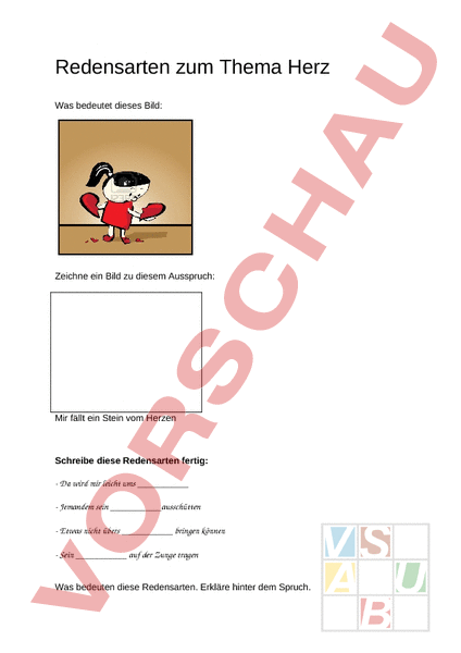 Redensarten zum Thema Herz Was bedeutet dieses Bild: Zeichne ein Bild zu diesem Ausspruch: Mir fällt ein Stein vom Herzen Schreibe diese Redensarten fertig: Da wird mir leicht ums Jemandem seinausschütten Etwas nicht übers bringen können Sein auf der Zunge tragen Was bedeuten diese Redensarten. Erkläre hinter dem Spruch. Schreibe die Redensarten mit diese Wörter fertig: prüfen verlieren Gold hören rechten Fleck haben Luft machen schliessen erobern Auf sein Herz Sein Herz Jemanden in Herz Sein Herz am Ein Herz aus Etwas auf Herz und Nieren Seinem Herzen Alle Herzen im Sturm Erfinde eine kurze Geschichte zu einer Redensart von oben. Zusatz: Finde möglichst viele Wörter mit Herz.