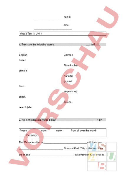 name: date: Vocab Test 1: Unit 1 1. Translate the following words. 10P English German frozen Pfannkuchen climate Kartoffel gesund flour Verpackung snack Zitrone search (vb) 2. Fill in the missing words below. frozen sons week 5P from all over the world Germany The Melanders live inwith their two, Finn and Kjell. This is the food they ate in one in November. Kjell loves to eat food like pizzas and ice cream. The food that the family buys comes total points: 15P name: date: Vocab Test 2: Unit 1 1. Translate the following words. English 10P German in the front zählbar, unzählbar shopper how many vergleichen sparen, retten would sprechen mit/ über reuse senken, reduzieren 2. Fill in the missing words below. 4P many much packaging learn There is so waste from food! We have to to reduce our rubbish. There is so possibilities to save reduce trash! total points: 14P name: date: Vocab Test 3: Unit 1 1. Translate the following words. English 10P German stuff hart, belastend jar illustrate (vb) ausschalten los gehts! well done! leer reuse Ecke 2. Fill in the missing words below. chop prepare 4P seasonal product recipe „How do we our spaghetti? „Well, let me see the. Hmmm. see. We first have to the tomatoes. We put the tomatoes in pan and boil it. „Is the tomato? total points: 14P