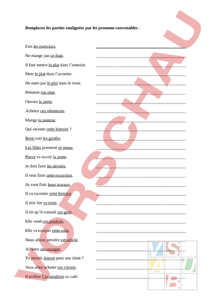 Remplacez les parties soulignées par les pronoms convenables Fais les exercices. Ne mange pas ce fruit. Il faut mettre le plat dans larmoire. Mets le plat dans larmoire. Ne mets pas le plat dans le tiroir. Présente ton plan. Ouvrez la porte. Achetez ces vêtements. Mange la pomme. Qui raconte cette histoire René voit les girafes. Les filles prennent ce menu. Pierre va ouvrir la porte. Je dois faire les devoirs. Il veut faire cette excursion. Ils vont finir leurs travaux. Il va raconter cette histoire. Il doit lire ce texte. Il dit quil connaît ces gens. Elle vend ces produits. Elle va essayer cette robe. Nous allons prendre cet article. Achetez ces oranges. Tu prends Jeanne pour une idote Vous allez acheter ces citrons. Il préfère lovomaltine au café. Il ne veut pas lire ce texte. Il aime leau minérale. Ne regardez pas la télé. Ne prends pas tes repas au lit. Il achète cette voiture. Il nachète pas ces produits. Ne mange pas cette viande. Nachète pas ces tomates. Roger va voir ses amies. Rends la gomme à Pierre. Je naime pas la salade. Fais les exercices. Il faut mettre le plat dans larmoire. Ne mets pas le plat dans le tiroir. Ninquiète pas les parents. Nouvrez pas la porte. Lisez le livre. Elle ne veut pas manger la pomme.