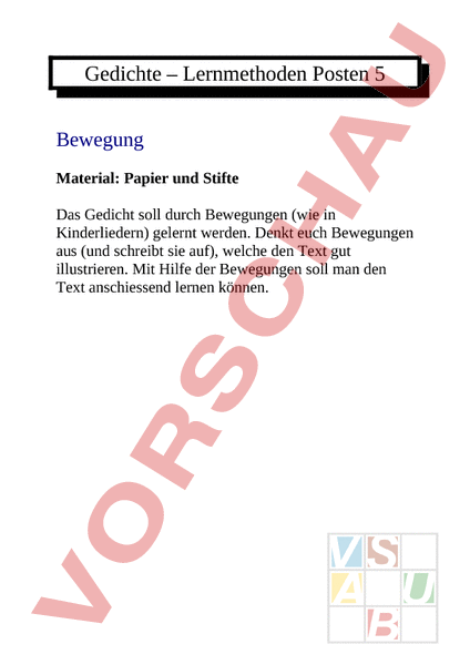 Gedichte – Lernmethoden Posten 5 Bewegung Material: Papier und Stifte Das Gedicht soll durch Bewegungen (wie in Kinderliedern) gelernt werden. Denkt euch Bewegungen aus (und schreibt sie auf), welche den Text gut illustrieren. Mit Hilfe der Bewegungen soll man den Text anschiessend lernen können.