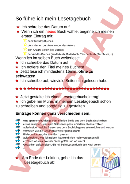 So führe ich mein Lesetagebuch Ich schreibe das Datum auf! Wenn ich ein neues Buch wähle, beginne ich meinen ersten Eintrag mit: dem Titel des Buches dem Namen der Autorin oder des Autors den Anzahl Seiten des Buches der Art des Buches (Kinderbuch, Bilderbuch, Taschenbuch, Sachbuch,.) Wenn ich im selben Buch weiterlese: Ich schreibe das Datum auf! Ich notiere den Titel meines Buches! Jetzt lese ich mindestens 15min.,ohne zu schwatzen. Ich schreibe auf, wieviele Seiten ich gelesen habe. Jetzt gestalte ich einen Lesetagebucheintrag! Ich gebe mir Mühe, in meinem Lesetagebuch schön zu schreiben und sorgfältig zu gestalten. Einträge können ganz verschieden sein: eine spannende, witzige oder traurige Stelle aus dem Buch abschreiben etwas zeichnen, was zum Gelesenen passt und dazu etwas erzählen aufschreiben welche Person aus dem Buch ich gerne sein möchte und warum vermuten wie die Geschichte weitergehen könnte Bilder aufkleben, die zum Buch passen aufschreiben, was ich gelernt habe und nicht mehr vergessen will erzählen was mir an einer Stelle gefällt und was nicht. Gedanken aufschreiben, die mir beim Lesen durch den Kopf gehen . Am Ende der Lektion, gebe ich das Lesetagebuch ab!