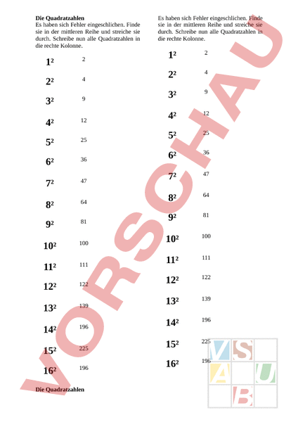 Die Quadratzahlen Es haben sich Fehler eingeschlichen. Finde sie in der mittleren Reihe und streiche sie durch. Schreibe nun alle Quadratzahlen in die rechte Kolonne. Es haben sich Fehler eingeschlichen. Finde sie in der mittleren Reihe und streiche sie durch. Schreibe nun alle Quadratzahlen in die rechte Kolonne. 1 2 2 4 4 2 9 3 9 3 4 4 12 12 5 5 25 25 6 6 36 36 47 7 47 7 8 8 64 64 9 9 81 81 100 10 100 10 11 11 111 111 12 12 122 122 139 139 13 196 14 196 14 15 15 225 225 16 16 196 196 1 2 13 Die Quadratzahlen