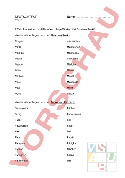 DEUTSCHTEST Teil Name. 2.Teil ohne Wörterbuch! Für jedes richtige Wort erhälst Du einen Punkt! Welche Wörter liegen zwischen Mann und Motor Morgen mindestens Motto Mannschaft Melodie Männchen Mantel manchmal Mangel Mädchen Mühe Möwe Märtyrer Monat Menü Mansarde Mais Mord Motiv motzen Welche Wörter liegen zwischen Fahne und Fasnacht fassungslos Fächer farbig Fahrausweis Faser Fall Faszination Fass Fax faul Faust Fabrik Fahrplan Fähigkeit Familie fälschen Fähnchen Fasan Fahrerflucht fast DEUTSCHTEST Name. Teil 1.Teil mit Wörterbuch! Versuche möglichst schnell diese Wörter im Duden zu finden! Du sollst immer das nächste fettgedruckte Wort fehlerfrei (!) aufschreiben. gar Wolf strapazieren Pomade Antrieb Wiedehopf schätzungsweise Prüfung Lady inwiefern Hirsch Essen Test lochen Wal korrekt begierig unbedeutend Roboter Depot