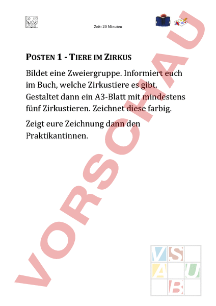 Zeit: 20 Minuten POSTEN 1 TIERE IM ZIRKUS Bildet eine Zweiergruppe. Informiert euch im Buch, welche Zirkustiere es gibt. Gestaltet dann ein A3-Blatt mit mindestens fünf Zirkustieren. Zeichnet diese farbig. Zeigt eure Zeichnung dann den Praktikantinnen.