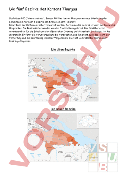 Die fünf Bezirke des Kantons Thurgau Nach über 200 Jahren trat am 1. Januar 2011 im Kanton Thurgau eine neue Gliederung der Gemeinden in nur noch 5 Bezirke (an Stelle von acht) in Kraft. Damit kann der Kanton einfacher verwaltet werden. Der Name des Bezirks ist auch der Name des Hauptortes. Die Bezirksämter werden von den Statthaltern geleitet. Der Statthalter ist verantwortlich für die Erhaltung der öffentlichen Ordnung und Sicherheit. Die Polizei ist ihm unterstellt. Er führt die Voruntersuchung bei Verbrechen, und ihm steht auch das Recht der Verhaftung und die Beurteilung kleinerer Vergehen zu. Die fünf Bezirksämter führen auch Bezirksgefängnisse. Die alten Bezirke Die neuen Bezirke Löse folgende Aufgaben: a. Fülle die Tabelle aus. b. Zeichne mit Hilfe der Thurgauerkarte die Hauptorte möglichst genau ein. Nummer Bezirk Hauptort Anzahl Gemeinden 1 2 3 4 5 23 13 18 14 12 Total 1 4 5 3 2 c. Zeichne in die Karte die Flüsse Sitter, Thur und Murg möglichst genau ein und beschrifte sie. d. Du siehst unten die fünf Wappen, welche zu den Bezirken gehören. Nimm ein weisses Blatt und zeichne eines davon ab. Weinfelden Arbon Münchwilen Kreuzlingen e. Zu welchen Regionen gehören die fünf Bezirke? Beschreibe! Beispiel: Der Bezirk Weinfelden gehört zur Region Typisch für diese Region ist/ sind Frauenfeld