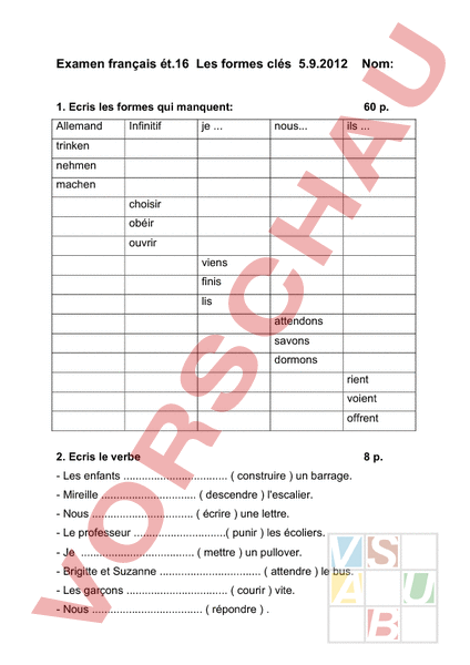 Examen français ét.16 Les formes clés 5.9.2012 Nom: 1. Ecris les formes qui manquent: 60 p. Allemand Infinitif je . nous. ils . trinken nehmen machen choisir obéir ouvrir viens finis lis attendons savons dormons rient voient offrent 2. Ecris le verbe Les enfants construire un barrage. Mireille . descendre lescalier. Nous . écrire une lettre. Le professeur ( punir les écoliers. Je . mettre un pullover. Brigitte et Suzanne . attendre le bus. Les garçons . courir vite. Nous répondre . 8 p. Total 68 points BONNE CHANCE! ton score: Note: