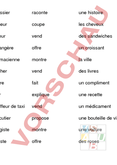le pâtisssier raconte une histoire le vendeur coupe les cheveux le coiffeur vend des sandwiches la boulangère offre un croissant la pharmacienne montre la ville le boucher vend des livres la libraire fait un compliment lépicier explique une recette le chauffeur de taxi vend un médicament le charcutier propose une bouteille de vin le garagiste montre une voiture la fleuriste offre des roses Verb mit Dativ couper demander dire donner écrir envoyer expliquer faire faire faire montrer offrir présenter promettre proposer raconter vendre qc. à qn. qc. à qn. qc. à qn. qc. à qn. qc. à qn. qc. à qn. qc. à qn. qc. à qn. qc. à qn. qc. à qn. qc. à qn. qc. à qn. qc. à qn. qc. à qn. qc. à qn. qc. à qn. téléphoner échaper à qn. à qn. aux enfants de Mme Fleurie aux petits garçons à une cliente à sa copine à Michel aux élèves à une touriste à une vieille dame au père de Nicolas au patron du restaurant à monsieur Wagner à madame Larousse