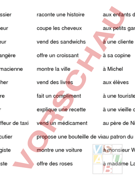 le pâtisssier raconte une histoire aux enfants de Mme Fleurie le vendeur coupe les cheveux aux petits garçons le coiffeur vend des sandwichs à une cliente la boulangère offre un croissant à sa copine la pharmacienne montre la ville à Michel le boucher vend des livres aux élèves la libraire fait un compliment à une touriste lépicier explique une recette à une vieille dame le chauffeur de taxi vend un médicament au père de Nicolas le charcutier propose une bouteille de vinau patron du restaurant le garagiste montre une voiture à monsieur Wagner la fleuriste offre des roses à madame Larousse