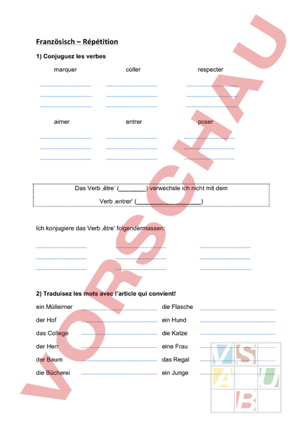 Französisch – Répétition 1) Conjuguez les verbes marquer coller respecter aimer entrer poser Das Verb ‚être‘ () verwechsle ich nicht mit dem Verb ‚entrer‘ (_) Ich konjugiere das Verb ‚être‘ folgendermassen: 2) Traduisez les mots avec larticle qui convient! ein Mülleimer die Flasche der Hof ein Hund das College die Katze der Herr eine Frau der Baum das Regal die Bücherei ein Junge