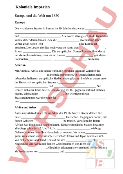 Koloniale Imperien Europa und die Welt um 1850 Europa Die wichtigsten Staaten in Europa im 19. Jahrhundert waren,,, und . Alle waren etwa gleich stark. Kein Staat konnte daher daran denken wie die zweitausend Jahre vorher getan hatten ein über Europa zu errichten. Der Letzte, der dies noch versucht hatte, war . Er war. Die europäischen Staaten konnten ihre Macht nur dadurch ausdehnen, dass sie in Übersee gründeten. So konnten entstehen. Amerika Mit Amerika, Afrika und Asien waren die Europäer schon im Zeitalter der in Kontakt gekommen. In Amerika hatten sich neben den Indianern europäische Siedler niedergelassen. Sie lebten zuerst unter der Herrschaft europäischer Staaten , und. Sie lehnten sich aber Ende des 18. Und Anfang 19. Jh. gegen sie auf und bildeten eigene, selbständige. Die wichtigste dieser Staatsgründungen war diejenige der von . Afrika und Asien Asien und Afrika kamen bis zur Mitte des 19. Jh. Nur zu einem kleinen Teil unter Herrschaft. Es ging nur darum, mit diesen Gebieten zu treiben. Vor allem das Innere Afrikas war ihnen noch kaum bekannt. Einige europäische Staaten begannen allerdings schon im 17. Und 18. Jh., wichtige Gebiete in Asien unter ihre Herrschaft zu nehmen. Vor allem geriet zunehmend unter britische Herrschaft. China und Japan schlossen sich von fast jedem Handel und Kontakt mit den ab. Neuseeland und Australien dienten Grossbritannien vor allem als -_. Allmählich erlangten sie wirtschaftliche Bedeutung als Produzenten von und.