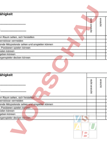 Lehrperson Spielfähigkeit weit übertroffen übertroffen erreicht nicht erreicht weit übertroffen übertroffen erreicht Thema: nicht erreicht Datum: den freien Raum sehen, sich freistellen Zusammenstösse vermeiden frei stehende Mitspielende sehen und anspielen können auf allen Positionen spielen können Tore erzielen können Assists geben können einen Gegenspieler decken können Lehrperson Spielfähigkeit weit übertroffen übertroffen erreicht nicht erreicht weit übertroffen übertroffen den freien Raum sehen, sich freistellen Zusammenstösse vermeiden frei stehende Mitspielende sehen und anspielen können auf allen Positionen spielen können Tore erzielen können Assists geben können einen Gegenspieler decken können erreicht Thema: nicht erreicht Datum: