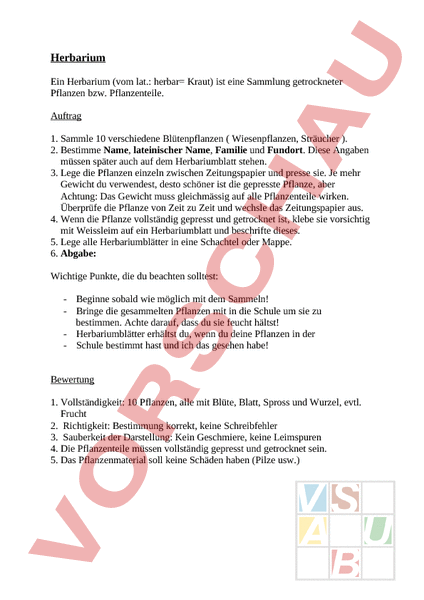 Herbarium Ein Herbarium (vom lat.: herbar Kraut) ist eine Sammlung getrockneter Pflanzen bzw. Pflanzenteile. Auftrag 1. Sammle 10 verschiedene Blütenpflanzen Wiesenpflanzen, Sträucher ). 2. Bestimme Name, lateinischer Name, Familie und Fundort. Diese Angaben müssen später auch auf dem Herbariumblatt stehen. 3. Lege die Pflanzen einzeln zwischen Zeitungspapier und presse sie. Je mehr Gewicht du verwendest, desto schöner ist die gepresste Pflanze, aber Achtung: Das Gewicht muss gleichmässig auf alle Pflanzenteile wirken. Überprüfe die Pflanze von Zeit zu Zeit und wechsle das Zeitungspapier aus. 4. Wenn die Pflanze vollständig gepresst und getrocknet ist, klebe sie vorsichtig mit Weissleim auf ein Herbariumblatt und beschrifte dieses. 5. Lege alle Herbariumblätter in eine Schachtel oder Mappe. 6. Abgabe: Wichtige Punkte, die du beachten solltest: Beginne sobald wie möglich mit dem Sammeln! Bringe die gesammelten Pflanzen mit in die Schule um sie zu bestimmen. Achte darauf, dass du sie feucht hältst! Herbariumblätter erhältst du, wenn du deine Pflanzen in der Schule bestimmt hast und ich das gesehen habe! Bewertung 1. Vollständigkeit: 10 Pflanzen, alle mit Blüte, Blatt, Spross und Wurzel, evtl. Frucht 2. Richtigkeit: Bestimmung korrekt, keine Schreibfehler 3. Sauberkeit der Darstellung: Kein Geschmiere, keine Leimspuren 4. Die Pflanzenteile müssen vollständig gepresst und getrocknet sein. 5. Das Pflanzenmaterial soll keine Schäden haben (Pilze usw.)