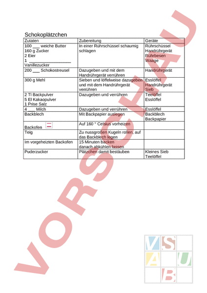 Schokoplätzchen Zutaten 100 weiche Butter 160 Zucker 2 Eier 1 Vanillezucker 200 Schokostreusel 300 Mehl 2 Tl Backpulver 5 El Kakaopulver 1 Prise Salz 4 Milch Backblech Backofen Teig Im vorgeheizten Backofen Puderzucker Zubereitung In einer Rührschüssel schaumig schlagen Geräte Rührschüssel Handrührgerät Rührbesen Waage Dazugeben und mit dem Handrührgerät verrühren Sieben und löffelweise dazugeben und mit dem Handrührgerät verrühren Dazugeben und verrühren Handrührgerät Dazugeben und verrühren Mit Backpapier auslegen Esslöffel Backblech Backpapier Esslöffel Handrührgerät Sieb Teelöffel Esslöffel Auf 160 Celsius vorheizen Zu nussgroßen Kugeln rollen, auf das Backblech legen 15 Minuten backen danach abkühlen lassen Plätzchen damit bestäuben Kleines Sieb Teelöffel Spitzbuben Zutaten Zubereitung In eine Rührschüssel sieben 500 Mehl 200 Zucker 200 Butter 1 Päckchen Vanillezucker 1 Päckchen Backpulver 4 Eier Backblech Backofen Teig Mehl Im vorgeheizten Backofen Aprikosenkonfitüre Puderzucker Dazugeben Zu einem festen Teig verkneten Mit Backpapier auslegen Geräte Waage Sieb Esslöffel Waage Handrührgerät Knethaken Backblech Backpapier Auf 150 vorheizen auf bemehltem Backbrett ca. 3mm dick ausrollen Mit der runden Form ausstechen Auf das Backblech legen 10 Minuten backen abkühlen lassen Ein Plätzchen damit bestreichen, dann ein Zweites darauf setzen. Plätzchen damit bestäuben Nudelholz Backbrett runde Ausstechform Teelöffel Kleines Sieb Teelöffel Ausstecherle Zutaten Zubereitung In eine Rührschüssel sieben 250 Mehl 125 Butter 125 Zucker 1 Päckchen Vanillezucker 1 Backpulver Backofen Teig Mehl 1 Ei Hagelzucker Im vorgeheizten Backofen Dazugeben zu einem festen Teig verkneten Geräte Waage Esslöffel Sieb Handrührgerät Knethaken Teelöffel Auf 170 vorheizen auf bemehltem Backbrett ca. 3mm dick ausrollen und mit verschiedenen Plätzchenformen ausstechen auf das Backblech legen Verquirlen Plätzchen damit bestreichen Plätzchen damit bestreuen 10 Minuten backen abkühlen lassen Nudelholz Ausstechförmchen Backbrett Tasse Gabel Pinsel Haselnussmakronen Zutaten 3 Eier 250 Zucker Zubereitung In einer Rührschüssel mit dem Handrührgerät schaumig schlagen 1 Päckchen Abrieb einer unterrühren Zitronenschale 1 Salz 300 gemahlene Haselnüsse 100 Mehl Sieben und unterrühren Backofen Backblech Teig Ganze Haselnüsse Im vorgeheizten Backofen Geräte Rührschüssel Handrührgerät Rührbesen Waage Esslöffel Sieb Auf 180 vorheizen Mit Backpapier auslegen In einen Spritzbeutel mit großer Lochtülle füllen Auf das Backblech walnussgroße Haufen setzen Jeweils eine ganze Haselnuss in die Mitte der Teighaufen eindrücken 10 Minuten backen abkühlen lassen Backblech Backpapier Spritzbeutel mit großer Lochtülle Teigschaber