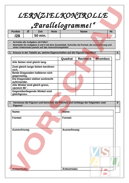 LERNZIELKONTROLLE „Parallelogramme! Punkte Ø /28 – – Zeit Note Name Nr. 50 min. Schreibe alle Aufgaben mit Füller! Bearbeite die Aufgaben 2 und 4 mit dem Zusatzblatt. Schreibe die Formel, die Ausrechnung und einen Antwortsatz jeweils auf das Ausrechnungsblatt! 1. Kreuze in der Tabelle an, welche Eigenschaften auf die Figuren zutreffen! Quadrat Rechteck 6 Rhombus Alle Seiten sind gleich lang. Zwei gleich lange Seiten berühren sich. Beide Diagonalen halbieren sich gegenseitig. Die Diagonalen stehen senkrecht aufeinander. Alle Winkel sind gleich gross, nämlich 90. Gegenüberliegende Winkel sind gleichgross. 2. Vermesse die Figuren und berechne die Flächen und Umfänge der folgenden zwei Figuren! Name: Name: Formel: Formel: Ausrechnung: Ausrechnung: Antwortsatz: Antwortsatz: 8 3. Berechne die folgenden Grössen und schreibe die Endresultate in die Tabelle! a) b) Fläche Seite Seite n Quadrat 34 mm Rhombu 10 cm c) Rechtec d) Quadrat ha/hb 9 6 cm 16 cm a) b) c) d) 304 cm2 196 m2 4. Vermesse die Figuren und berechne die ausgefüllte Fläche und den Umfang! 5 Formel: Ausrechnung Antwortsatz: Zusatzblatt Aufgabe 2 Aufgabe 4 LERNZIELKONTROLLE „Parallelogramme! Punkte Ø /28 – – – – Zeit Note Name Nr. 45 min. Schreibe alle Aufgaben mit Füller! Bearbeite die Aufgaben 2 und 3 mit dem Zusatzblatt. Schreibe die Formel, die Ausrechnung und einen Antwortsatz jeweils aufs Ausrechnungsblatt! Schreibe die Resultate mit roter Farbe und unterstreiche die Resultate doppelt! Du darfst das Formelbüchlein benützen! 5. Kreuze in der Tabelle an, welche Eigenschaften auf die Figuren zutreffen! Quadrat Alle Seiten gleich lang Zwei gleich lange Seiten berühren sich. Beide Diagonalen halbieren sich gegenseitig. Die Diagonalen stehen senkrecht aufeinander. Alle Winkel sind gleich gross, nämlich 90. Gegenüberliegende Winkel sind gleichgross. Rechteck Rhombus x 6 X Jede Linie 1 Punkt 1Fehler nur Punkt, ansonsten keiner 6. Vermesse die Figuren und berechne die Flächen und Umfänge der folgenden zwei Figuren! Name: Rombus Name: Parallelogramm (1/2 P.) Formel: A U Formel: Ausrechnung: Ausrechnung: (2 P.) (2 P.) 5,1 3,8 cm 19.38 cm 7,9 cm 3,8 cm 30.02 cm 4 5,1 cm 20.4 cm 2 4,3 cm 7,9 cm 2 24.4 cm U (je 1/2 P.) 8 Antwortsatz: Antwortsatz: Zusatzblatt Aufgabe 2 Aufgabe 4 7. Berechne die folgenden Grössen und schreibe die Endresultate in die Tabelle! a) Fläche Seite Seite n Quadrat 34 mm ha/hb 136 mm 1156 mm b) Rhombu c) Rechtec 10 cm 6 cm 40 cm 60 cm 19 cm 16 cm 70 cm d) Quadrat 14 14 56 304 cm2 196 m2 ) b) ) d) 8. Vermesse die Figuren und berechne die ausgefüllte Fläche und den Umfang! Formel: x (1/2 P.) A x (1/2 P.) Ausrechnun g: Rechteck: 6,7 cm 3,8 cm 25.46 cm (1 P.) Rhombus: 2,4 cm 2,1 cm 5.04 cm (1 P. A 25,46 cm – 5,04 cm 20.42 (1P.) 9 5 6,7cm 2 3,8cm 2 2,4cm 4 30.6 cm (1 P.) Antwortsatz:
