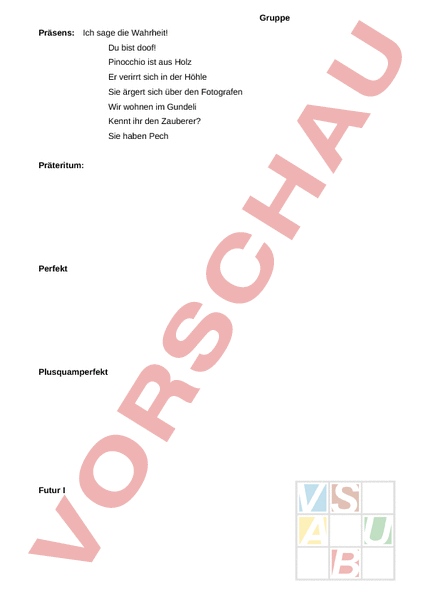 Gruppe Präsens: Ich sage die Wahrheit! Du bist doof! Pinocchio ist aus Holz Er verirrt sich in der Höhle Sie ärgert sich über den Fotografen Wir wohnen im Gundeli Kennt ihr den Zauberer? Sie haben Pech Präteritum: Perfekt Plusquamperfekt Futur