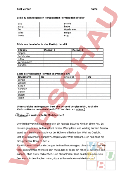 Test Verben Name Bilde zu den folgenden konjugierten Formen den Infinitiv ass sang fiel teilte boxte schrie hatte überlistete neigte trug Bilde aus dem Infinitiv das Partizip und II Infinitiv singen bedrücken rufen zertrümmern anrufen Partizip Partizip II Setze die verlangten Formen im Präsens ein: Grundform du er/sie/es sehen wissen geben nehmen treffen sitzen lesen ihr Unterstreiche im folgenden Text alle Verben! Vergiss nicht, auch die Verbzusätze zu unterstreichen! (Z.B: anrufen: ich rufe an) Umkreise zusätzlich die Modalverben! Unmittelbar vor ihm klammerte sich ein nacktes braunes Kind an einen Ast. Es musste gerade erst laufen gelernt haben. Winzig klein und wacklig auf den Beinen stand es mitten in der Nacht vor der Höhle und lachte dem Wolf ins Gesicht. »Ist das ein Menschenjunges?«, fragte Mutter Wolf erstaunt. »Ich hab noch nie eins gesehen. Bring es her! « Ein Wolf kann mühelos ein Junges im Maul herumtragen, ohne ihm auch nur ein Haar zu krümmen. Wenn es sein muss, hält er sogar ein rohes Ei zwischen den Zähnen, ohne es zu zerbrechen. Und obwohl Vater Wolf das Kind am Rücken fasste und in den Rachen nahm, ritzte er ihm nicht einmal die Haut auf. Behutsam setzte er den Kleinen zwischen den eigenen Jungen ab. »Wie niedlich er ist!«, sagte Mutter Wolf zärtlich. »Wie nackt und wie unerschrocken!« Der Winzling zwängte sich zwischen die Wolfsjungen ans warme Fell. »Aha«, rief Mutter Wolf, »er will mit den anderen trinken. Das also ist ein Menschenjunges! Sag selbst, bin ich nicht die erste Wölfin, die mit ihren eigenen Kindern auch ein Menschenjunges säugt?« Setze das passende Modalverb ein, Hinweise gibt dir die Spalte rechts! Du sofort hierher kommen! Zwang Eigentlich ich lieber hierbleiben Wunsch/Absicht Hierihr schwimmen Erlaubnis Ich jetzt nicht gestört werden! Wille ich heute wohl früher schlafen gehen? Möglichkeit Ihr beide gut miteinander tanzen Fähigkeit Setze das passende Modalverb ein, manchmal gibt es zwei Möglichkeiten Natürlich es wieder mal keiner gewesen sein! Schade, dass du schon gehen . Er das nicht machen, ich habe es verboten. Ich dich beim besten Willen nicht verstehen! Unglaublich! Und das Werner gesagt haben? jemand etwas essen? Nein danke, wir haben keinen Hunger, aber wir etwas trinken. Ich begreife nicht, was du damit sagen Unterstreiche im folgenden Text NUR die Hilfsverben! Ich habe mir ein Tagebuch gekauft! Es hat ein Schloss und einen vornehmen Ledereinband. Bald werde ich beginnen, meinem Tagebuch meine Geheimnisse anzuvertrauen. Früher hatte ich auch schon mal ein Tagebuch gehabt und fand das sehr toll. Ich habe mir immer vorgestellt: Eines Tages werde ich mich zur Tagebuchschreiberin ausbilden!
