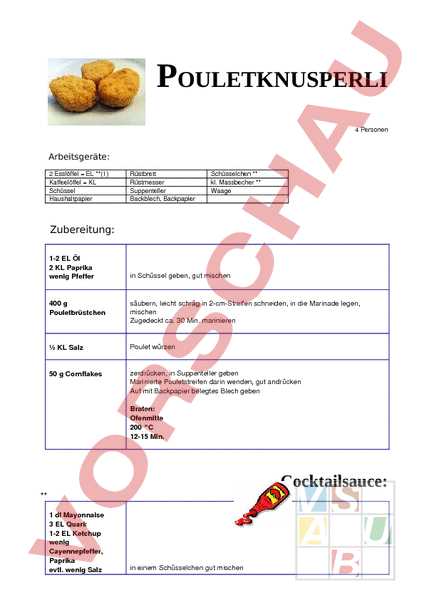 POULETKNUSPERLI 4 Personen Arbeitsgeräte: 2 Esslöffel EL **(1) Kaffeelöffel KL Schüssel Haushaltpapier Rüstbrett Rüstmesser Suppenteller Backblech, Backpapier Schüsselchen ** kl. Massbecher ** Waage Zubereitung: 12 EL Öl 2 KL Paprika wenig Pfeffer in Schüssel geben, gut mischen 400 Pouletbrüstchen säubern, leicht schräg in 2cmStreifen schneiden, in die Marinade legen, mischen Zugedeckt ca. 30 Min. marinieren KL Salz Poulet würzen 50 Cornflakes zerdrücken, in Suppenteller geben Marinierte Pouletstreifen darin wenden, gut andrücken Auf mit Backpapier belegtes Blech geben Braten: Ofenmitte 200 C 1215 Min. Cocktailsauce: ** 1 dl Mayonnaise 3 EL Quark 12 EL Ketchup wenig Cayennepfeffer, Paprika evtl. wenig Salz in einem Schüsselchen gut mischen