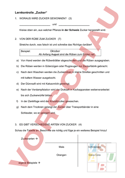 Lernkontrolle „Zucker 1. WORAUS WIRD ZUCKER GEWONNEN? (3) und Kreise oben ein, aus welcher Pflanze in der Schweiz Zucker hergestellt wird. 2. VON DER RÜBE ZUM ZUCKER (7) Streiche durch, was falsch ist und schreibe das Richtige darüber! Beispiel: Oktober Ab Anfang August sind die Rüben zum Ernten reif. a) Von Hand werden die Rübenblätter abgeschnitten und die Rüben ausgegraben. b) Die Rüben werden in Güterzügen oder Flugzeugen zur Zuckerfabrik gebracht. c) Nach dem Waschen werden die Zuckerrüben in kleine Streifen geschnitten und mit kaltem Wasser ausgekocht. d) Der Dünnsaft wird mit Kakaomilch gereinigt. e) Nach der Verdampfstation wird der Dicksaft in Kochapparaten weiterverarbeitet bis sich Zuckerwürfel bilden. f) In der Zentrifuge wird der Kristallzucker gewaschen. g) Nach dem Trocknen gelangt der Zucker über Transportbänder in eine Schleuder, wo er gelagert wird. 3. ES GIBT VERSCHIEDENE ARTEN VON ZUCKER (4) Schau die Tabelle an. Beschrifte sie richtig und füge je ein weiteres Beispiel hinzu! Zuckerarten à eigene Beispiele à Mais Schokolade Orangen Coca Cola 4. GESCHICHTE DES ZUCKERS (3) Der Zucker kommt ursprünglich aus Was brauchten die Menschen im Mittelalter, um eine Speise zu süssen? Die Zuckerrübe wird in Europa immer mehr angebaut. Wann war das? Kreise die richtige Zahl ein: vor etwa 2000 1000 500 150 50 Jahren 5. ANBAU UND ERNTE VON ZUCKERROHR (4) Schreibe eine kurze Erklärung, wie Zuckerrohr angebaut und geerntet wird. 6. ANBAU UND ERNTE DER ZUCKERRÜBE (5) Verbinde, was zusammengehört und beschreibe mit 2-3 Worten, was passiert! Ende März Anfang April ¡ Nach etwa 2 Wochen ¡ Nach 6 Wochen ¡ Mitte Juni ¡ Im Hochsommer ¡ Ab Anfang Oktober ¡ 7. DIE ZUCKERRÜBE (3) Schreibe 2 Teile der Zuckerrübe an (Pfeile zum Bild einzeichnen). Kreise die Stelle blau ein, wo sich der Zucker bildet. 8. WENN DER KÖRPER ZUCKER NICHT VERWERTEN KANN (1) Wir haben einen Text von Michel gelesen. Sein Körper kann kein Insulin produzieren. Michel ist zuckerkrank. Wie nennt man diese Krankheit auch noch? Erreichte Punkte: 30