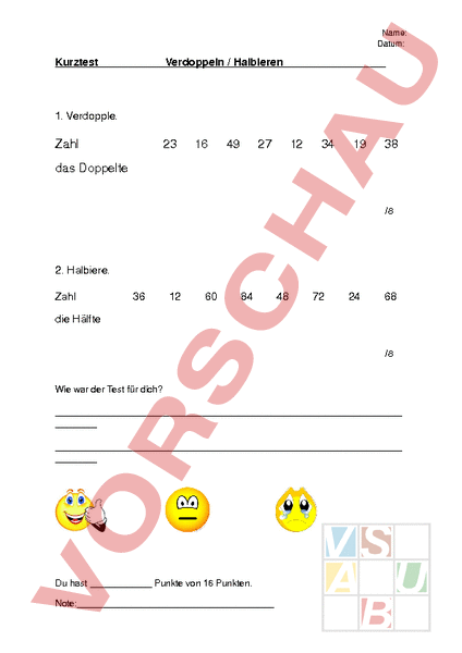 Name: Datum: Kurztest Verdoppeln Halbieren 1. Verdopple. Zahl 23 16 49 27 12 34 19 38 das Doppelte /8 2. Halbiere. Zahl 36 12 60 84 48 72 24 68 die Hälfte /8 Wie war der Test für dich? Du hast Punkte von 16 Punkten. Note: Name: Datum: Unterschrift Eltern: