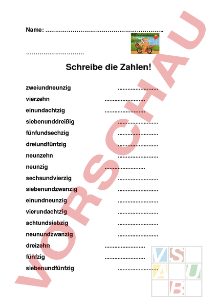Name: . Schreibe die Zahlen! zweiundneunzig . vierzehn . einundachtzig . siebenunddreißig . fünfundsechzig . dreiundfünfzig . neunzehn . neunzig . sechsundvierzig . siebenundzwanzig . einundneunzig . vierundachtzig . achtundsiebzig . neunundzwanzig . dreizehn . fünfzig . siebenundfünfzig .
