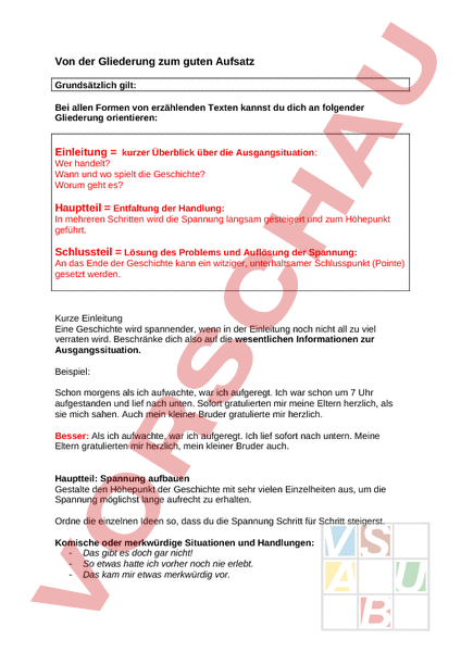 Von der Gliederung zum guten Aufsatz Grundsätzlich gilt: Bei allen Formen von erzählenden Texten kannst du dich an folgender Gliederung orientieren: Einleitung kurzer Überblick über die Ausgangsituation: Wer handelt? Wann und wo spielt die Geschichte? Worum geht es? Hauptteil Entfaltung der Handlung: In mehreren Schritten wird die Spannung langsam gesteigert und zum Höhepunkt geführt. Schlussteil Lösung des Problems und Auflösung der Spannung: An das Ende der Geschichte kann ein witziger, unterhaltsamer Schlusspunkt (Pointe) gesetzt werden. Kurze Einleitung Eine Geschichte wird spannender, wenn in der Einleitung noch nicht all zu viel verraten wird. Beschränke dich also auf die wesentlichen Informationen zur Ausgangssituation. Beispiel: Schon morgens als ich aufwachte, war ich aufgeregt. Ich war schon um 7 Uhr aufgestanden und lief nach unten. Sofort gratulierten mir meine Eltern herzlich, als sie mich sahen. Auch mein kleiner Bruder gratulierte mir herzlich. Besser: Als ich aufwachte, war ich aufgeregt. Ich lief sofort nach untern. Meine Eltern gratulierten mir herzlich, mein kleiner Bruder auch. Hauptteil: Spannung aufbauen Gestalte den Höhepunkt der Geschichte mit sehr vielen Einzelheiten aus, um die Spannung möglichst lange aufrecht zu erhalten. Ordne die einzelnen Ideen so, dass du die Spannung Schritt für Schritt steigerst. Komische oder merkwürdige Situationen und Handlungen: Das gibt es doch gar nicht! So etwas hatte ich vorher noch nie erlebt. Das kam mir etwas merkwürdig vor. Spannende oder dramatische Situationen und Handlungen: Ich dachte: „ Jetzt ist es aus! Es kam bedrohlich nahe. Es sah etwas gefährlich aus. Unterhaltsamer Schluss Hier geht es – wie bei der Einleitung – nicht darum, möglichst viel und in allen Einzelheiten zu erzählen, sondern das Ende der Handlung kurz und prägnant zu formulieren. Der Schluss kann auch eine Schlussbemerkung beinhalten, die zum Weiterdenken über die Geschichte oder zum Schmunzeln anregt. Fantasie- oder Traumgeschichte: Nach dem Unterricht ärgerte ich mich, dass ich mit dem Zauberhandy aus meinem Traum nicht gleich die anderen Aufgaben gelöst hatte. Aber vielleicht träume ich ja noch einmal. Erlebnis- oder Abenteuergeschichte: Jetzt hatte ich erst einmal genug von Abenteuern! Nie wieder würde ich so etwas riskieren. Wenn aber meine Freunde in den nächsten Ferien nach Afrika.