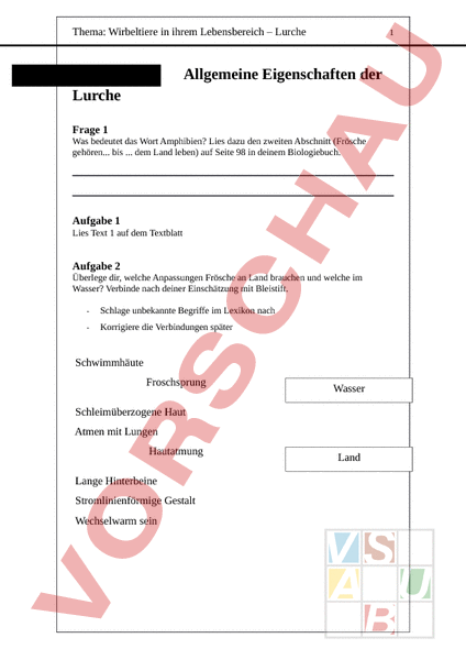 Arbeitsblatt über Eigenschaften der Lurche, das sich am Übergang der Tetrapoden vom Wasser zum Land orientiert.