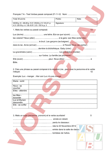 Français 7 - Test Verbes passé composé 27-11-12 Nom: . Total 30 points Points: 30/29 p: 6 28-26 p: 5.5 25/24 p: 5 23-21 p: 4.5 20/19 p: 4 18-16 P: 3.5 15/14 p: 3 Signature: Note: 1. Mets les verbes au passé composé: 13 Luc (écrire) une lettre. Est-ce que tu(voir) . les voisins? Nous (aller) . à la gare. Les filles (entendre) . le bruit. Les garçons (se baigner) dans le lac. Anne (arriver) . à lheure! Nous (se cacher) .derrière la bibliothèque. Gaby (crier) . La grandmère (venir) . Le grandpère (monter) . sur larbre. La famille (se promener) Elle (avoir) .peur. Nous (être) . à Bâle. 2. Fais une phrase au passé composé à la négation (ne.pas) avec la personne et le verbe indiqué: 12 Exemple: Luc manger Hier soir Luc na pas mangé Marie sortir Nous se coucher Elles attendre les filles bavarder Luc et Myriam descendre Elle se coiffer 3. Mets un sujet (personne, pronom) et le verbe auxiliaire! . arivée en retard. . perdu le classseur. . née le 23 Novembre 2012 . entrés dans la salle de classe. . tombées de larbre. 5