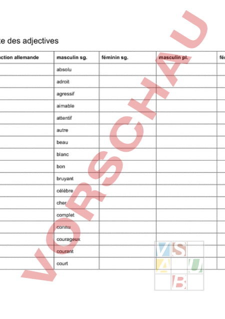 Liste des adjectives traduction allemande masculin sg. féminin sg. masculin pl. féminin pl. adverbe absolu adroit agressif aimable attentif autre beau blanc bon bruyant célèbre cher complet connu courageux courant court 1 définitif discret doux ennuyeux énorme faux fidèle fou franc furieux gai génial gentil grand gratuit grave gros habile haut 2 heureux honnête industriel italien jaune jeune joli juste laid léger lent long lourd maladroit mauvais méchant meilleur merveilleux mouillé 3 neuf nouveau pâle pareil passif patient poli profond propre prudent régulier riche ridicule rouge sale sérieux sévère sincère soigneux 4 sombre sportif suffisant supportable timide total tranquille utile variable vieux vif violant vrai 5