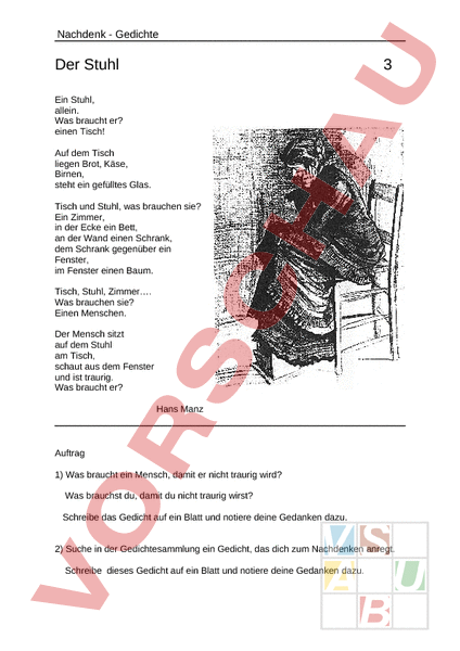 Nachdenk Gedichte Der Stuhl 3 Ein Stuhl, allein. Was braucht er? einen Tisch! Auf dem Tisch liegen Brot, Käse, Birnen, steht ein gefülltes Glas. Tisch und Stuhl, was brauchen sie? Ein Zimmer, in der Ecke ein Bett, an der Wand einen Schrank, dem Schrank gegenüber ein Fenster, im Fenster einen Baum. Tisch, Stuhl, Zimmer. Was brauchen sie? Einen Menschen. Der Mensch sitzt auf dem Stuhl am Tisch, schaut aus dem Fenster und ist traurig. Was braucht er? Hans Manz Auftrag 1) Was braucht ein Mensch, damit er nicht traurig wird? Was brauchst du, damit du nicht traurig wirst? Schreibe das Gedicht auf ein Blatt und notiere deine Gedanken dazu. 2) Suche in der Gedichtesammlung ein Gedicht, das dich zum Nachdenken anregt. Schreibe dieses Gedicht auf ein Blatt und notiere deine Gedanken dazu.