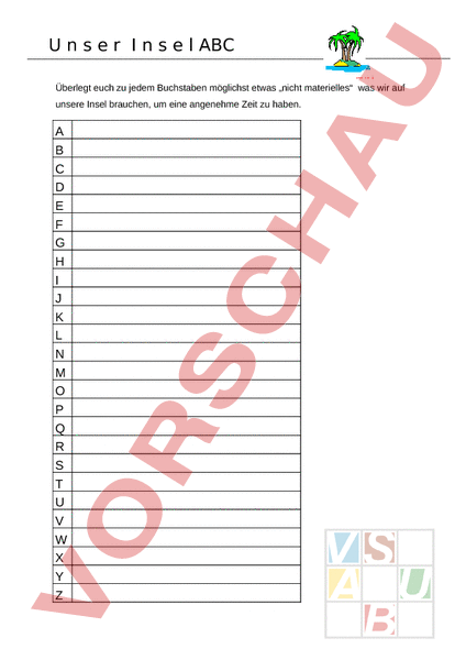 U s r n e ABC Überlegt euch zu jedem Buchstaben möglichst etwas „nicht materielles was wir auf unsere Insel brauchen, um eine angenehme Zeit zu haben. B D F H J L M P R T V X Z