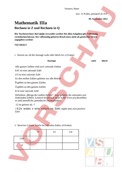 Arbeitsblatt: Prüfung: Rechnen in Z und Q
