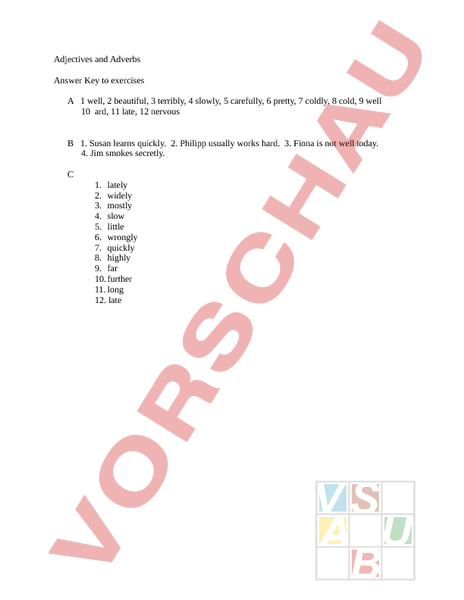Adjectives and Adverbs Answer Key to exercises 1 well, 2 beautiful, 3 terribly, 4 slowly, 5 carefully, 6 pretty, 7 coldly, 8 cold, 9 well 10 ard, 11 late, 12 nervous 1. Susan learns quickly. 2. Philipp usually works hard. 3. Fiona is not well today. 4. Jim smokes secretly. 1. lately 2. widely 3. mostly 4. slow 5. little 6. wrongly 7. quickly 8. highly 9. far 10. further 11. long 12. late