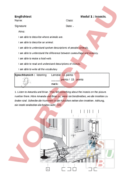 Englishtest Modul 1 Insects Name: Class: Signature: Date: Aims: am able to describe where animals are. am able to describe an animal. am able to understand spoken descriptions of people/ animals. am able to understand the difference between camouflage and mimicry. am able to make food web. am able to read and understand descriptions of insects. am able to write all the vocabulary Sprachbereich listening Lernziel: 11 points points 15 points mark: 1. Listen to Amanda and Brian. They tell something about the insects on the picture. number them. Höre Amanda und Brian zu, wenn sie beschreiben, wo die Insekten zu finden sind. Schreibe die Nummern in die Kästchen neben den Insekten. Achtung, ein Insekt entdecken die beiden nicht. (10) 2. Listen to the sentences and draw the arrows. Höre dir die Sätze an und zeichne die Pfeile. (5) Sprachbereich writing Lernziel: 21 points points 33 points mark: 1. Complete these sentences. Vervollständige diese Sätze. (4) 2. What is the difference between camouflage and mimicry Schreibe die Antwort auf Deutsch. (1) 3. Translate the sentences. Übersetze die Sätze. (16) Fishes swim in the water. Ein Vogel hat zwei Flügel. Vögel sind Feinde von Insekten. An insect is under leaf. Ein Baum hat viele Äste. Mein Lieblingsgemüse sind Karotten. There is farm in our village. The farmer collects eggs every morning. 4. Fill in the opposite. Ergänze mit dem Gegenteil. (5) exampel small tall correct easy dirty useful sell 5. Wheres the animal Write down three sentences about the position of these animals. Schreibe drei Sätze über die Position der Tiere. (3) 6. Use the table and write sentence for every insect. Benutze die Tabelle und schreibe einen Satz für jedes Insekt. (4) Sprachbereich reading Lernziel: 15 points points 23 points mark: 1. Find an ending for every sentence. Verbinde ein Anfang mit einem passenden ein Ende für jeden Satz. (5) 3. Read what five pupils wrote about insects they saw. Number the insects 1 to 5. Write the names of the insects on the lines. Nummeriere die Insekten von 1 – 5 und schreibe ihre Namen auf die Linien. (Mücke mosquito) (9) 2. Read the description of the animals and try to find the correct name. Lies die Beschreibungen der Tiere und versuche den richtigen Namen dazu zu finden (verbinde). (9)