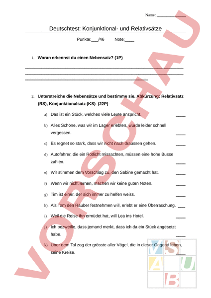 Name: Deutschtest: Konjunktional- und Relativsätze Punkte:_/46 Note: 1. Woran erkennst du einen Nebensatz? (1P) 2. Unterstreiche die Nebensätze und bestimme sie. Abkürzung: Relativsatz (RS), Konjunktionalsatz (KS) (22P) a) Das ist ein Stück, welches viele Leute anspricht. b) Alles Schöne, was wir im Lager erlebten, wurde leider schnell vergessen. c) Es regnet so stark, dass wir nicht nach draussen gehen. d) Autofahrer, die ein Rotlicht missachten, müssen eine hohe Busse zahlen. e) Wir stimmen dem Vorschlag zu, den Sabine gemacht hat. f) Wenn wir nicht lernen, machen wir keine guten Noten. g) Tim ist einer, der sich immer zu helfen weiss. h) Als Tom den Räuber festnehmen will, erlebt er eine Überraschung. i) Weil die Reise ihn ermüdet hat, will Lea ins Hotel. j) Ich bezweifle, dass jemand merkt, dass ich da ein Stück angesetzt habe. k) Über dem Tal zog der grösste aller Vögel, die in dieser Gegend leben, seine Kreise. Name: 3. Verbinde die zwei Sätze zu einem Satz. Bestimme, ob du einen Relativsatz oder einen Konjunktionalsatz daraus gemacht hast. Benutze die selben Abkürzungen wie bei Aufgabe 2. Setze wo nötig Kommas. (16P) Ich treffe mich mit meiner Freundin. Sie wohnt in Bern. Tim will eine Pause machen. Sie hat sie sich verdient. Ich konnte meine Hausaufgaben nicht machen. Ich habe sie in der Schule vergessen. Die Schule fällt aus. Alle Schüler freuen sich. Er sucht etwas im Internet. Es bietet sehr viele Möglichkeiten. Nina will ihren Bruder anrufen. Dieser ist aber leider nicht zu Hause. Tina hat ihre Schwestern eingeladen. Diese essen beide sehr gerne Kuchen. Der Brief enthält erfreuliche Nachrichten. Ich habe ihn soeben erhalten. Name: 4. Fülle die Lücken mit passenden Pronomen. (7P) a) Er lädt sie ins Theater ein, sie sehr freut. b) Das war sein erstes Ziel, er anstreben musste. c) Sie meint Max Frisch, ich sehr schätze. d) Eine Autorin, Bücher gerne von Kindern gelesen werden, heisst Federica de Cesco. e) Das Kind, Velo gestohlen wurde, ist untröstlich. f) Der Zug, wir erreichen wollten, ist schon abgefahren. g) Wir erreichten das Postauto, einige Minuten später abfuhr.