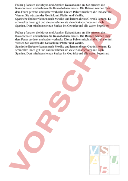 Früher pflanzten die Mayas und Azteken Kakaobäume an. Sie ernteten die Kakaoschoten und nahmen die Kakaobohnen heraus. Die Bohnen wurden über dem Feuer geröstet und später verhackt. Dieses Pulver mischten die Indianer mit Wasser. Sie würzten das Getränk mit Pfeffer und Vanille. Spanische Eroberer kamen nach Mexiko und lernten dieses Getränk kennen. Es schmeckte ihnen gut und darum nahmen sie viele Kakaoschoten mit nach Spanien. Dort mischten sie nun Zucker ins Getränkt und alle waren begeistert. Früher pflanzten die Mayas und Azteken Kakaobäume an. Sie ernteten die Kakaoschoten und nahmen die Kakaobohnen heraus. Die Bohnen wurden über dem Feuer geröstet und später verhackt. Dieses Pulver mischten die Indianer mit Wasser. Sie würzten das Getränk mit Pfeffer und Vanille. Spanische Eroberer kamen nach Mexiko und lernten dieses Getränk kennen. Es schmeckte ihnen gut und darum nahmen sie viele Kakaoschoten mit nach Spanien. Dort mischten sie nun Zucker ins Getränkt und alle waren begeistert.