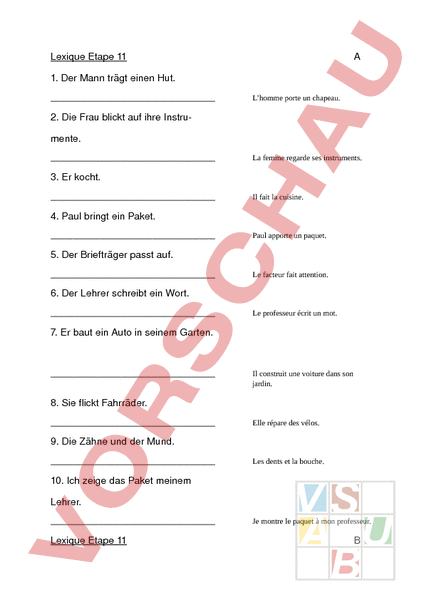Lexique Etape 11 1. Der Mann trägt einen Hut. Lhomme porte un chapeau. 2. Die Frau blickt auf ihre Instru mente. La femme regarde ses instruments. 3. Er kocht. Il fait la cuisine. 4. Paul bringt ein Paket. Paul apporte un paquet. 5. Der Briefträger passt auf. Le facteur fait attention. 6. Der Lehrer schreibt ein Wort. Le professeur écrit un mot. 7. Er baut ein Auto in seinem Garten. Il construit une voiture dans son jardin. 8. Sie flickt Fahrräder. Elle répare des vélos. 9. Die Zähne und der Mund. Les dents et la bouche. 10. Ich zeige das Paket meinem Lehrer. Lexique Etape 11 Je montre le paquet à mon professeur. 1. Der Briefträger passt auf. Le facteur fait attention. 2. Ich zeige das Paket meinem Lehrer. Je montre le paquet à mon professeur. 3. Er baut ein Auto in seinem Garten. Il construit une voiture dans son jardin. 4. Die Zähne und der Mund. Les dents et la bouche. 5. Der Mann trägt einen Hut. Lhomme porte un chapeau. 6. Sie flickt Fahrräder. Elle répare des vélos. 7. Er kocht. Il fait la cuisine. 8. Der Lehrer schreibt ein Wort. Le professeur écrit un mot. 9. Paul bringt ein Paket. Paul apporte un paquet. 10. Die Frau blickt auf ihre Instru mente. La femme regarde ses instruments.