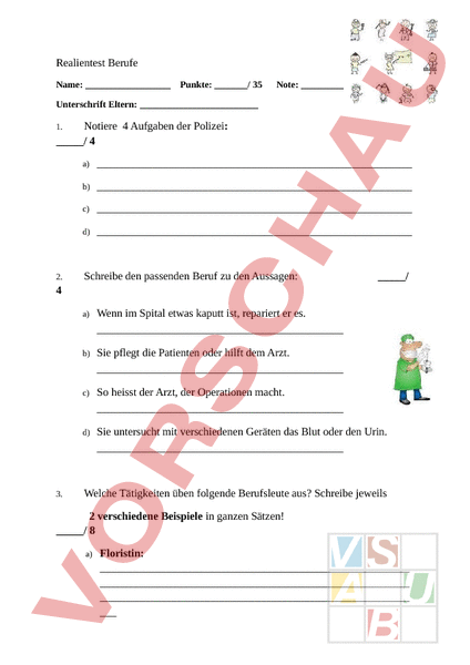 Realientest Berufe Name: Punkte:/ 35 Note: Unterschrift Eltern: Notiere 4 Aufgaben der Polizei:/ 4 1. 2. a) b) c) d) Schreibe den passenden Beruf zu den Aussagen:/ 4 a) Wenn im Spital etwas kaputt ist, repariert er es. b) Sie pflegt die Patienten oder hilft dem Arzt. c) So heisst der Arzt, der Operationen macht. d) Sie untersucht mit verschiedenen Geräten das Blut oder den Urin. 3. Welche Tätigkeiten üben folgende Berufsleute aus? Schreibe jeweils 2 verschiedene Beispiele in ganzen Sätzen!/ 8 a) Floristin: 4. b) Förster: c) Musiker: d) Astronaut: Notiere die folgenden Berufe in die richtige Spalte! / 9 Verkäufer, Schreiner, Pilot, Krankenpfleger, Schriftsteller, Wirt, Maurer, Gärtner, Polymechaniker, Jäger Fülle die leeren Spalten mit weiteren Beispielen! Dienstleistungen Handwerk und Industrie Landwirtschaft und Bergbau Im Mittelalter: Fülle den Lückentext! /10 5. wurden die Bäcker genannt. Sie hatten dreimal in der Woche zu backen. Steinmetzen verarbeiteten die . Ihre Werkzeuge waren Stäbe zum Abtragen der Masse, Winkel, Steinhammer und . Der läutete die und die Kirchen. Ein hütete das der Stadtbewohner. Die Frau des verkauft einem Bauern ein paar Schuhe, die stets auf angefertigt wurden. Selbstbeurteilung: Vorbereitung auf den Test: Leistung: