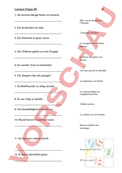 Lexique Etape 26 1. Sie hat eine Menge Ketten im Ausland. Elle un tas de colliers à létranger. 2. Die Ausländerin ist stolz. Létrangère est fière. 3. Die Reisende ist guter Laune. La voyageuse est de bonne humeur. 4. Der Skifahrer gehört zu einer Gruppe. Le skieur fait partie dun groupe. 5. Ein solcher Turm ist schrecklich. Une tour pareille est horrible. 6. Die Sängerin hat sich geärgert. La chanteuse sest fâchée. 7. Die Brieffreundin ist völlig verrückt. La correspondante est complètement folle. 8. Es war nötig zu lächeln. Il fallait sourire. 9. Die Gewalttätigkeit ist ein Horror. La violence est une horreur. 10. Marcel hat ein Couvert zerrissen. Marcel déchiré une enveloppe. 11. Du hast eine schöne Schrift. Tu as une belle écriture. 12. Er hat es absichtlich getan. Il la fait exprès. 13. Der Unbekannte ist lächerlich. Linconnu est ridicule. Lexique Etape 26 1. Die Brieffreundin ist völlig verrückt. La correspondante est complètement folle. 2. Der Unbekannte ist lächerlich. Linconnu est ridicule. 3. Er hat es absichtlich getan. Il la fait exprès. 4. Du hast eine schöne Schrift. Tu as une belle écriture. 5. Marcel hat ein Couvert zerrissen. Marcel déchiré une enveloppe. 6. Die Gewalttätigkeit ist ein Horror. La violence est une horreur. 7. Es war nötig zu lächeln. Il fallait sourire. 8. Sie hat eine Menge Ketten im Ausland. Elle un tas de colliers à létranger. 9. Die Sängerin hat sich geärgert. La chanteuse sest fâchée. 10. Ein solcher Turm ist schrecklich. Une tour pareille est horrible. 11. Der Skifahrer gehört zu einer Gruppe. 12. Die Reisende ist guter Laune. Le skieur fait partie dun groupe. La voyageuse est de bonne humeur. 13. Die Ausländerin ist stolz. Létrangère est fière.
