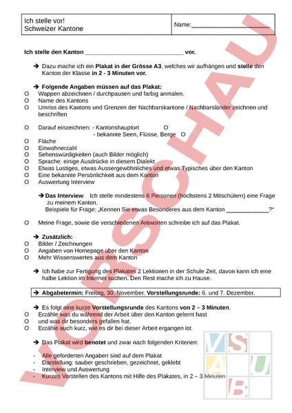 Ich stelle vor! Schweizer Kantone Name: Ich stelle den Kanton vor. Dazu mache ich ein Plakat in der Grösse A3, welches wir aufhängen und stelle den Kanton der Klasse in 2 3 Minuten vor. O Folgende Angaben müssen auf das Plakat: Wappen abzeichnen durchpausen und farbig anmalen. Name des Kantons Umriss des Kantons und Grenzen der Nachbarskantone Nachbarsländer zeichnen und beschriften Darauf einzeichnen: Kantonshauptort - bekannte Seen, Flüsse, Berge Fläche Einwohnerzahl Sehenswürdigkeiten (auch Bilder möglich) Sprache: einige Ausdrücke in diesem Dialekt Etwas Lustiges, etwas Aussergewöhnliches und etwas Typisches über den Kanton Eine bekannte Persönlichkeit aus dem Kanton Auswertung Interview O O O Das Interview: Ich stelle mindestens 6 Personen (höchstens 2 Mitschülern) eine Frage zu meinem Kanton. Beispiele für Frage: „Kennen Sie etwas Besonderes aus dem Kanton? Meine Frage, sowie die verschiedenen Antworten schreibe ich auf das Plakat. Zusätzlich: Bilder Zeichnungen Angaben von Homepage über den Kanton Mehr Wissenswertes aus dem Kanton Ich habe zur Fertigung des Plakates 2 Lektionen in der Schule Zeit, davon kann ich eine halbe Lektion im Internet suchen. Den Rest mache ich zu Hause. Abgabetermin: Freitag, 30. November. Vorstellungsrunde: 6. und 7. Dezember. Es folgt eine kurze Vorstellungsrunde des Kantons von 2 – 3 Minuten. Erzähle was du während der Arbeit über den Kanton gelernt hast und was dir besonders gefallen hat. Erzähle auch kurz, wie es dir bei dieser Arbeit ergangen ist. Das Plakat wird benotet und zwar nach folgenden Kriterien: Alle geforderten Angaben sind auf dem Plakat Darstellung: sauber geschrieben, gezeichnet, geklebt Interview und Auswertung Kurzes Vorstellen des Kantons mit Hilfe des Plakates, in 2 – 3 Minuten