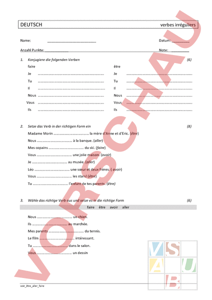 DEUTSCH verbes irréguliers Name: _ Anzahl Punkte: 1. Konjugiere die folgenden Verben Datum: _ Note: _ (6) faire Je . Je . Tu . Tu . Il Il . Nous . Vous . Ils être . Nous . Vous . Ils . 2. Setze das Verb in der richtigen Form ein (8) Madame Morin la mère dAnne et dEric. (être) Nous à la banque. (aller) Mes copains du ski. (faire) Vous une jolie maison. (avoir) Je au musée. (aller) Léo une sœur et deux frères. ( avoir) Vous les stars! (être) Tu lenfant de tes parents. (être) 3. Wähle das richtige Verb aus und setze es in die richtige Form faire être avoir aller Nous un chien. Ils au marchée. Mes parents du tennis. Le film intéressant. Tu dans le salon. Vous un dessin voir_être_aller_faire (6)