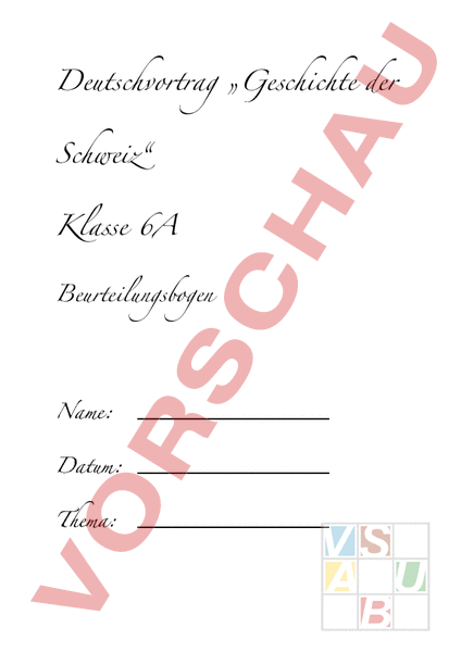 Deutschvortrag „Geschichte der Schweiz Klasse 6A Beurteilungsbogen Name: Datum: Thema: Du kannst dein Thema in Teilthemen aufteilen und die Informationen entsprechend zuordnen. Du kannst deinen Vortrag planen und deine Zeit einteilen. Du findest Informationen, die für deinen Vortrag wichtig sind. 0 Du kannst die Sachtexte für deinen Vortrag verstehen. Du kannst einen guten Anfang und einen guten Schluss für deinen Vortrag finden. Du kannst ausgewählte Informationen aus deinem Vortrag grafisch darstellen (Plakat, Tabelle, Balkendiagramm). Du kannst mit Hilfe deiner Notizen (Stichworte) frei sprechen. Du achtest auf Körperhaltung Kontakt zum Publikum Gesichtsausdruck und Stimme. Du bittest dein Publikum um ein Feedback und nimmst dieses entgegen. Du kannst die vorgegebene Zeit einhalten. Bewertung: Punkte:/39 Note: Kommentar: