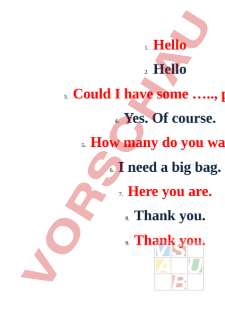 3. 1. Hello 2. Hello Could have some , please? Yes. Of course. 4. 5. How many do you want 6. need big bag. 7. Here you are. 8. Thank you. 9. Thank you. 10. Good bye. 11. Good bye.