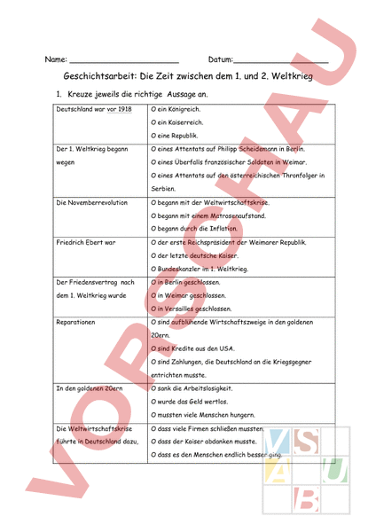 Name: Datum: Geschichtsarbeit: Die Zeit zwischen dem 1. und 2. Weltkrieg 1. Kreuze jeweils die richtige Aussage an. Deutschland war vor 1918 ein Königreich. ein Kaiserreich. eine Republik. Der 1. Weltkrieg begann eines Attentats auf Philipp Scheidemann in Berlin. wegen eines Überfalls französischer Soldaten in Weimar. eines Attentats auf den österreichischen Thronfolger in Serbien. Die Novemberrevolution begann mit der Weltwirtschaftskrise. begann mit einem Matrosenaufstand. begann durch die Inflation. Friedrich Ebert war der erste Reichspräsident der Weimarer Republik. der letzte deutsche Kaiser. Bundeskanzler im 1. Weltkrieg. Der Friedensvertrag nach in Berlin geschlossen. dem 1. Weltkrieg wurde in Weimar geschlossen. in Versailles geschlossen. Reparationen sind aufblühende Wirtschaftszweige in den goldenen 20ern. sind Kredite aus den USA. sind Zahlungen, die Deutschland an die Kriegsgegner entrichten musste. In den goldenen 20ern sank die Arbeitslosigkeit. wurde das Geld wertlos. mussten viele Menschen hungern. Die Weltwirtschaftskrise dass viele Firmen schließen mussten. führte in Deutschland dazu, dass der Kaiser abdanken musste. dass es den Menschen endlich besser ging. 2. Ergänze die Tabelle mit den passenden Jahreszahlen bzw. Ereignissen. Jahreszahl geschichtliches Ereignis 1. Weltkrieg November Novemberrevolution und Ausruf der Republik Juni 1919 Juli Gründung der Weimarer Republik 1923 Die goldenen 20er ab 1929 3. Nenne mindestens drei Gründe, warum die Deutschen den Versailler Vertrag als Demütigung empfanden. Was wurde ihnen auferlegt? 4. Beschreibe, welche Folgen die Weltwirtschaftskrise in Deutschland hatte. 5. Warum begeisterten sich immer mehr Menschen für demokratiefeindliche Parteien?