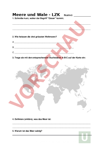 Meere und Wale LZK Name: 1. Schreibe kurz, woher der Begriff Ozean kommt. 2. Wie heissen die drei grössten Weltmeere? 3. Trage sie mit den entsprechenden Buchstaben ABC auf der Karte ein: 4. Definiere (erkläre), was das Meer ist: 5. Warum ist das Meer salzig? 6. Welchen Gefahren sind die Meere ausgesetzt? Schreibe mindestens drei Gründe, weshalb wir zu den Ozeanen Sorge tragen müssen. 7. Ergänze den Lückentext. Es gibt etwa verschiedene Arten von Walen und Delfinen. Sie sind keine Fische sondern. Fische atmen durch . Wale und Delfine atmen mit . Fische schlüpfen aus Eiern, Wale und Delfine aber . 8. Nenne hier 4 Walarten, die du kennst. 9. Wale ernähren sich aus dem Meer. )hr „Mund ist auf zwei verschiedene Arten „ausgerüstet. Wie heissen diese zwei Walarten? (Oberbegriffe) und 10. Nenne drei Fakten zum Blas der Wale. 11. Nenne drei wichtige Fakten zu „deinem Meerestier: Lernziele Thema Meer und Wale Ich kann den Begriff Meer definieren. Ich weiss, wie der Begriff Ozean entstanden ist. Ich weiss, warum das Meer salzig ist. Ich kenne die drei grossen Weltmeere und weiss, wo sie liegen. Ich kenne einige Ursachen, die den Lehensraum Meer gefährden. Ich kenne die wesentlichen Unterschiede zwischen Fischen und Walen, zwischen Barten und Zahnwalen. Ich weiss einige Fakten zum Blas und zur Echolokation. Ich kann zu meinem Meerestier einige wichtige Punkte aufzählen