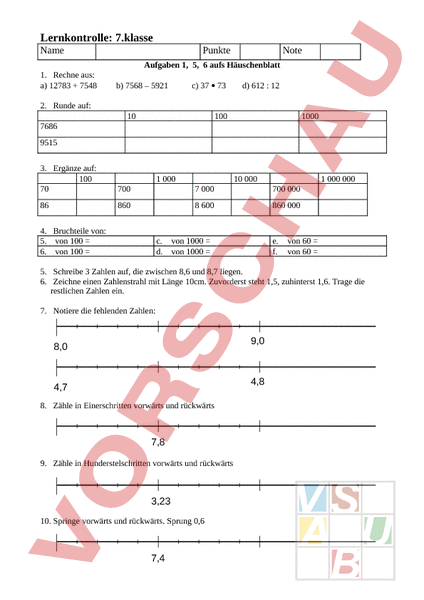 Lernkontrolle: 7.klasse Name Punkte Note Aufgaben 1, 5, 6 aufs Häuschenblatt 1. Rechne aus: a) 12783 7548 c) 37 • 73 b) 7568 – 5921 d) 612 12 2. Runde auf: 10 100 1000 7686 9515 3. Ergänze auf: 100 70 700 7 000 700 000 86 860 8 600 860 000 1 000 4. Bruchteile von: 5. von 100 6. von 100 c. d. 10 000 von 1000 von 1000 1 000 000 e. f. von 60 von 60 5. Schreibe 3 Zahlen auf, die zwischen 8,6 und 8,7 liegen. 6. Zeichne einen Zahlenstrahl mit Länge 10cm. Zuvorderst steht 1,5, zuhinterst 1,6. Trage die restlichen Zahlen ein. 7. Notiere die fehlenden Zahlen: 9,0 8,0 4,8 4,7 8. Zähle in Einerschritten vorwärts und rückwärts 7,8 9. Zähle in Hunderstelschritten vorwärts und rückwärts 3,23 10. Springe vorwärts und rückwärts. Sprung 0,6 7,4