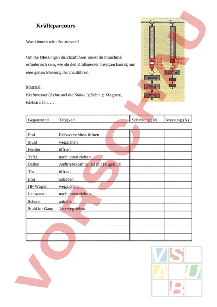 Kräfteparcours Was können wir alles messen? Um die Messungen durchzuführen musst du manchmal erfinderisch sein, wie du den Kraftmesser ansetzen kannst, um eine genau Messung durchzuführen. Material: Kraftmesser (Achte auf die Stärke!); Schnur; Magnete, Klebstreifen, Gegenstand Tätigkeit Etui Reissverschluss öffnen Stuhl wegziehen Fenster öffnen Tafel nach unten ziehen Ballon Auftriebskraft (er ist mit H2 gefüllt) Tür öffnen Etui anhaben HP-Wagen wegziehen Leinwand nach unten ziehen Schere anheben Stuhl im Gang 1 wegziehen Schätzung (N) Messung (N)