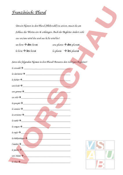 Französisch: Plural Um ein Nomen in den Plural (Mehrzahl) zu setzen, musst du am Schluss des Wortes ein -s anhängen. Auch der Begleiter ändert sich: aus un/une wird des und aus le/la wird les! un livre des livres une plante des plantes le livre les livres la plante les plantes Setze die folgenden Nomen in den Plural! Benutze den richtigen Begleiter! le crocodil la clarinette le fichier une école une gomme un vélo la poupée le camion la serviette la table le crayon le stylo la bibliothèque latelier le jardin une chaise le chat