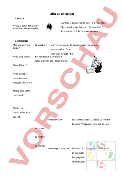 Aller au restaurant La carte Garçon, je peux avoir la carte, sil vous plaît? Voilà, la carte, Monsieur Madame Mademoiselle. On pourrait avoir la carte, sil vous plaît Je pourrais avoir la carte des boissons Commander Que voulez-vous boire Vous avez choisi Je voudrais un verre de coca de jus doranges de pommes une bouteille deau une tasse de café thé Un moment, sil vous plaît. Nous navons pas encore choisi. Vous désirez Vous prenez le menu ou vous mangez à la carte Merci pour votre commande. Voilà, vos commandes. Bon appétit comme entrée la salade maison la salade de tomates la soupe doignons la soupe du jour Je prends Je préfère Je choisis comme plat principal le canard à lorange avec les légumes le cassoulet les spaghettis le hamburger comme dessert le steak-frites le fromage la tarte aux pommes la glace aux fraises le mousse au chocolat le menu à euros. Payer Voilà, laddition, Monsieur. [Ça fait euros, sil vous plaît.] Vous avez aimé Cétait à vos goûts Merci beaucoup. Au revoir. Monsieur Madame, je peux avoir laddition Garçon, laddition, sil vous plaît. [Ça fait combien ?] Cétait très bien délicieux, merci. Voilà, gardez le reste le reste est pour vous. Au revoir.