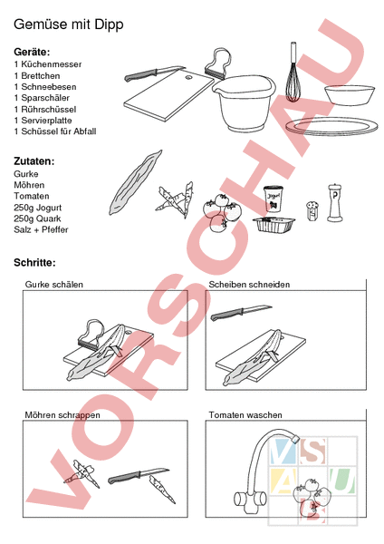 Gemüse mit Dipp Geräte: 1 Küchenmesser 1 Brettchen 1 Schneebesen 1 Sparschäler 1 Rührschüssel 1 Servierplatte 1 Schüssel für Abfall Zutaten: Gurke Möhren Tomaten 250g Jogurt 250g Quark Salz Pfeffer Schritte: Gurke schälen Scheiben schneiden Möhren schrappen Tomaten waschen schlechte Stellen entfernen Tomaten schneiden Gemüse anrichten Dipp Jogurt und Quark in die Schüssel verrühren abschmecken mit Salz Pfeffer Dipp umfüllen